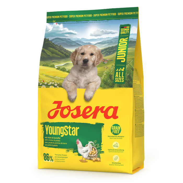 Karma Josera YoungStar to bezzbożowa sucha karma stworzona specjalnie dla szczeniąt i młodych psów wszystkich ras od szóstego tygodnia życia. Receptura oparta na delikatnym kurczaku i ziemniakach została precyzyjnie dostosowana do intensywnych potrzeb rozwijających się organizmów, wspierając prawidłowy rozwój kości, mięśni oraz układu nerwowego. Zawiera aż 86% białka zwierzęcego w całkowitej zawartości białka, co gwarantuje doskonałą przyswajalność aminokwasów. Karma może być podawana przez cały okres wzrostu aż do osiągnięcia dojrzałości, co eliminuje stres związany ze zmianą karmy.