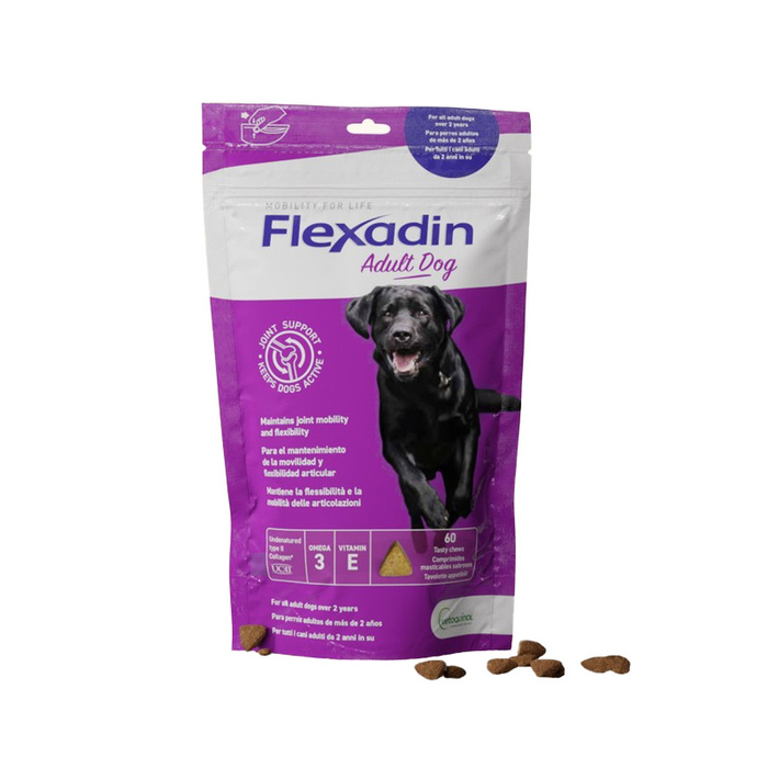 To ekskluzywne połączenie wysokiej jakości, naturalnych składników zaprojektowany w celu utrzymania mobilności i elastyczności stawów dorosłych psów w wieku powyżej 2 lat. Jego innowacyjna formuła obejmuje niezdenaturowany kolagen typu II (UCII®), ważny składnik chrząstki stawowej. Obecność tego składnika wspiera stawy poprzez korzystne działanie immunomodulujące. O potwierdzonym pozytywnym i długotrwałym działaniu na stawy psów.* Konsekwentnie podawany Flexadin pomoże utrzymać psa w aktywności i mobilności na dłużej, zapobiegać problemom z poruszaniem się, które mogą objawiać się w późniejszym wieku. Bo zdrowe stawy to radość na dłużej!